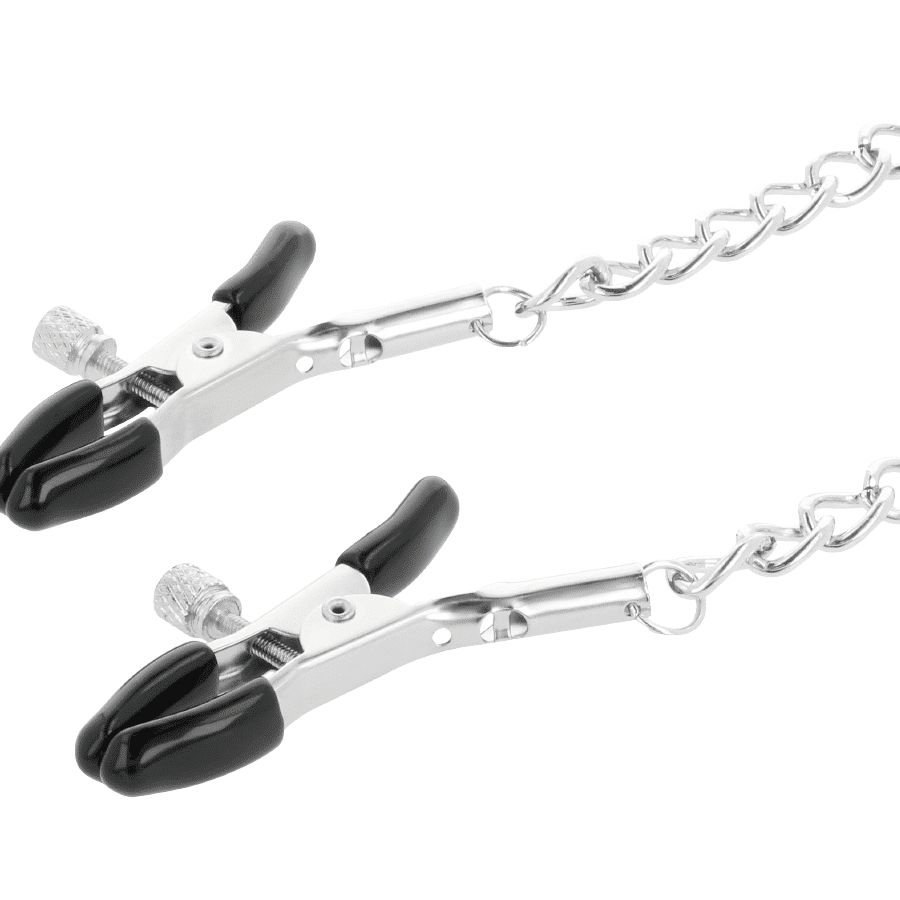 ¡Estas pinzas para pezones con cadena de Darkness! son unisex y muy fáciles de utilizar. Las pinzas y la cadena se han elaborado con acero inoxidable y aluminio. No contienen níquel. Puede utilizar las pinzas para pezones para sus traviesos secretos o como complemento estimulador mientras penetra a su amante.