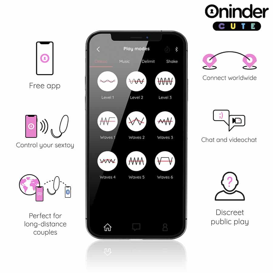 Con este vibrador no solamente puedes elegir entre combinaciones de intensidad y vibraciones preestablecidas, sino que también puedes compartir a un innovador control basado en una aplicación. Simplemente tienes que descargar la aplicación gratuita ONINDER™ en tu dispositivo Android o iOS y conectar tu smartphone o Tablet.