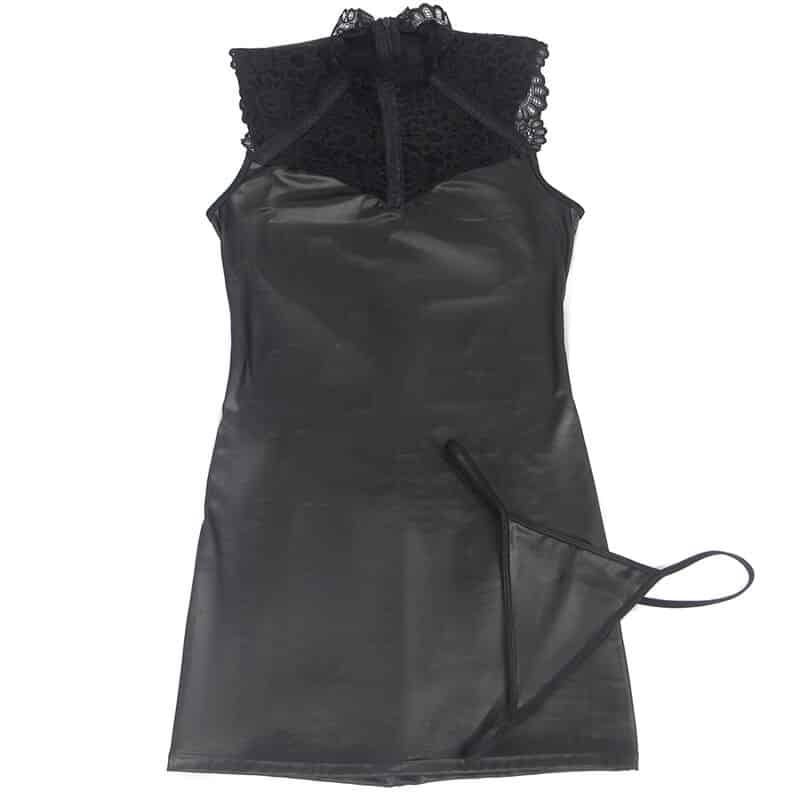 - Diseño Sofisticado: Este vestido de lencería combina el encaje negro con detalles de cuero, creando un contraste visualmente impactante que emana sensualidad y sofisticación.