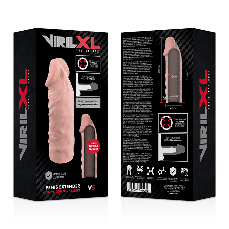 Aumenta tu grosor e intensifica el placer para ambos con esta funda para el pene VirilXL Extensión. Esta suave y elástica manga se puede recortar, para así adaptarse a la mayoría de los tamaños. Simplemente recorta por donde empieza el glande y ya estas listo para la acción. Sentirás cada sensación y tu pareja disfrutará de un nuevo grosor.