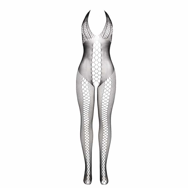 - Estilo: Bodystocking negro con espalda abierta y detalles entrecruzados.